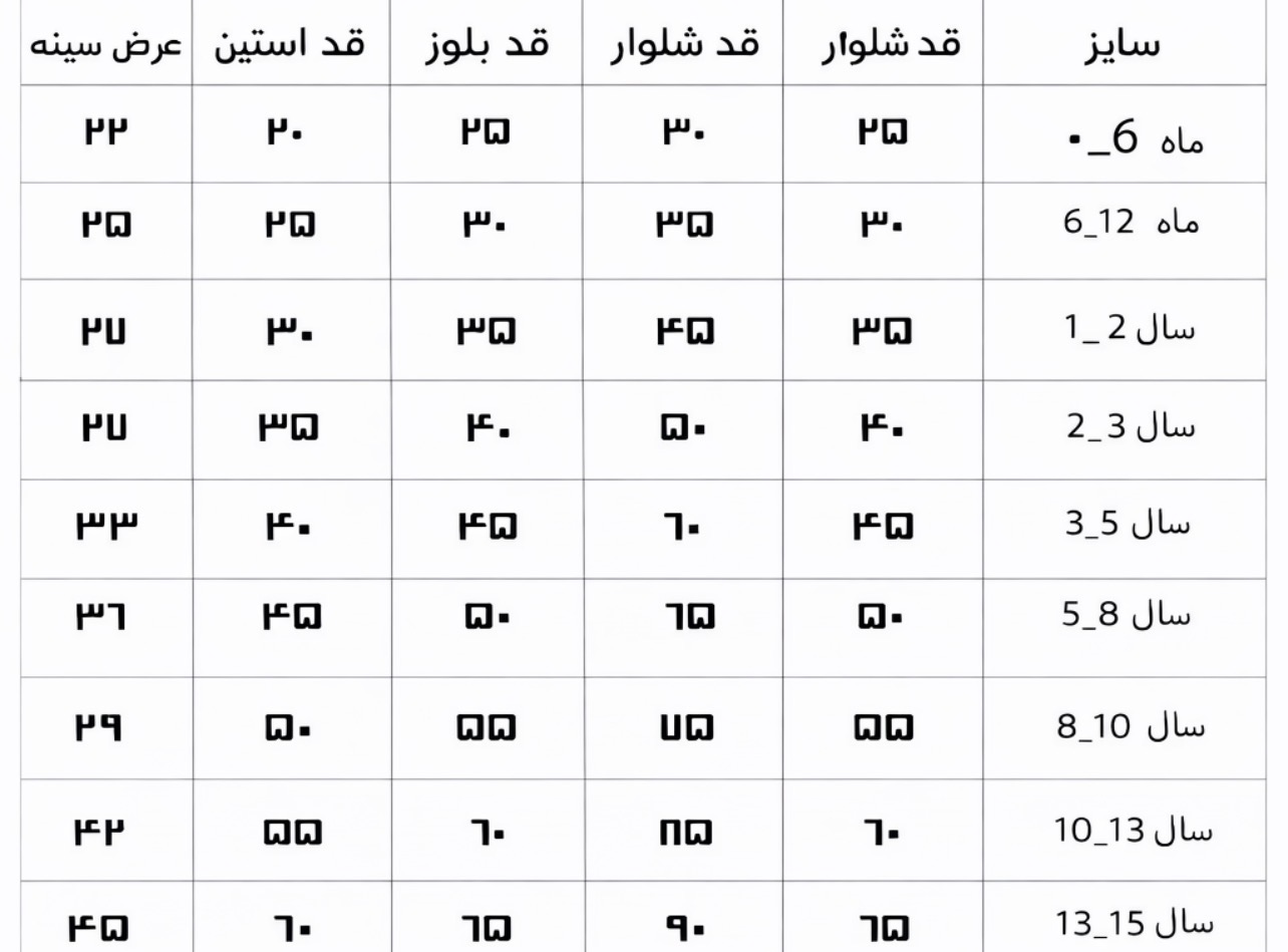 رده سنی | سایز | قد شلوار | قد بلوز | قد آستین | عرض سینه