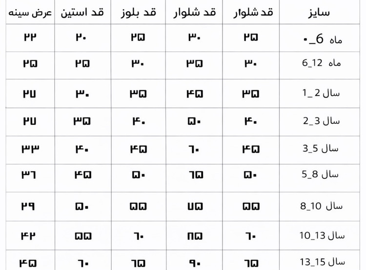 رده سنی | سایز | قد شلوار | قد بلوز | قد آستین | عرض سینه