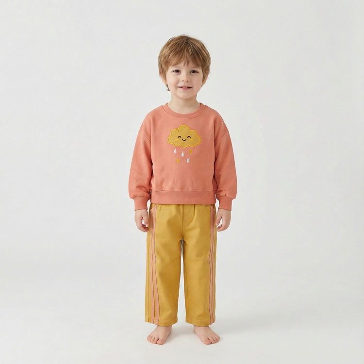 طرح منحصر به فرد: طرح ابر خندان گلدوزی شده بر روی بلوز، با رنگهای شاد و ظریف (مانند قرمز/صورتی و قطرههای باران رنگی)، ظاهری شیرین و دوستداشتنی به لباس بخشیده است.
