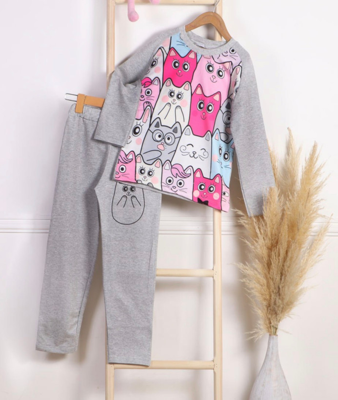 بلوز شلوار تمام چاپ گربه سایز ۸تا۱۳سال آستین بلند